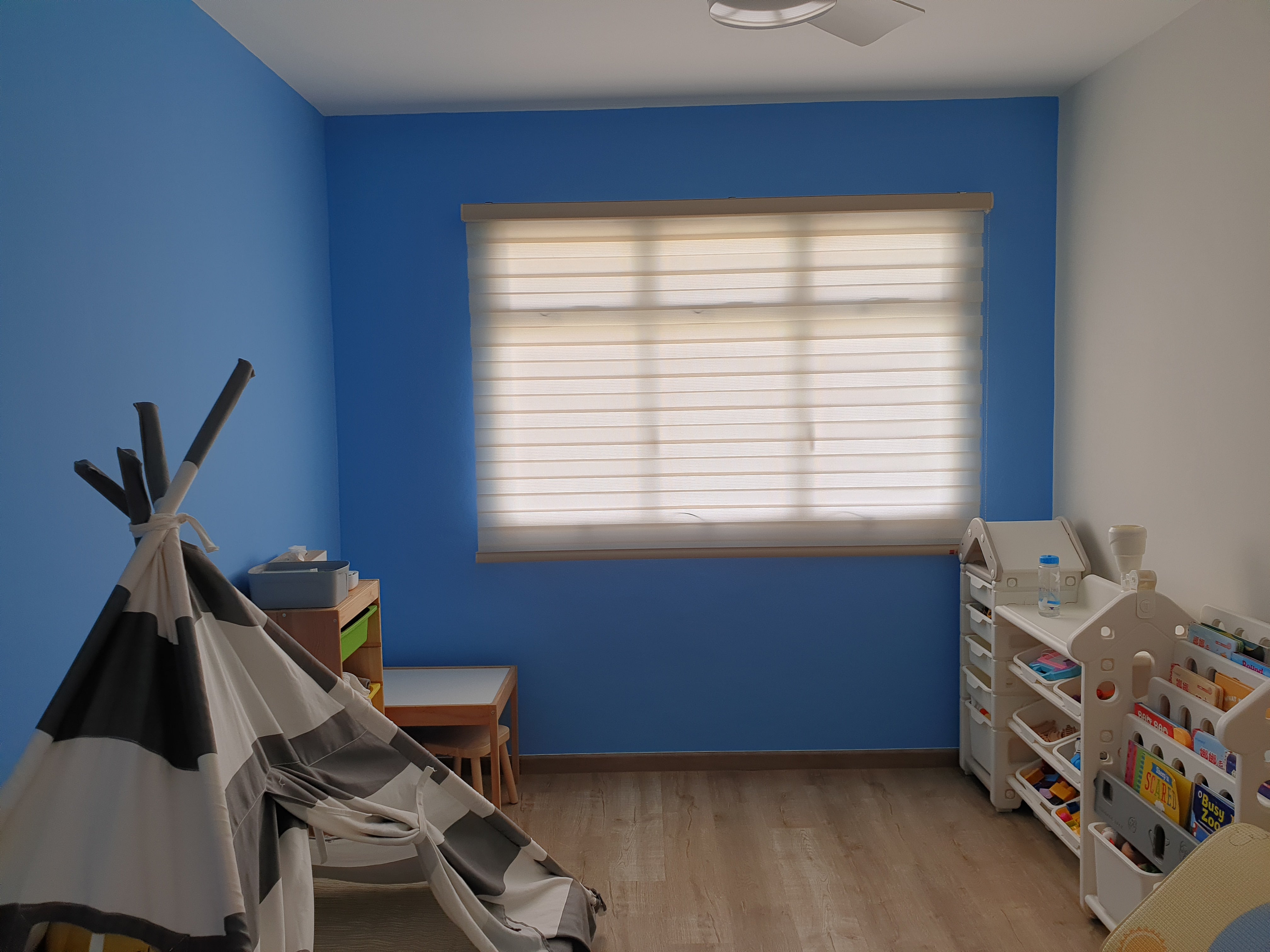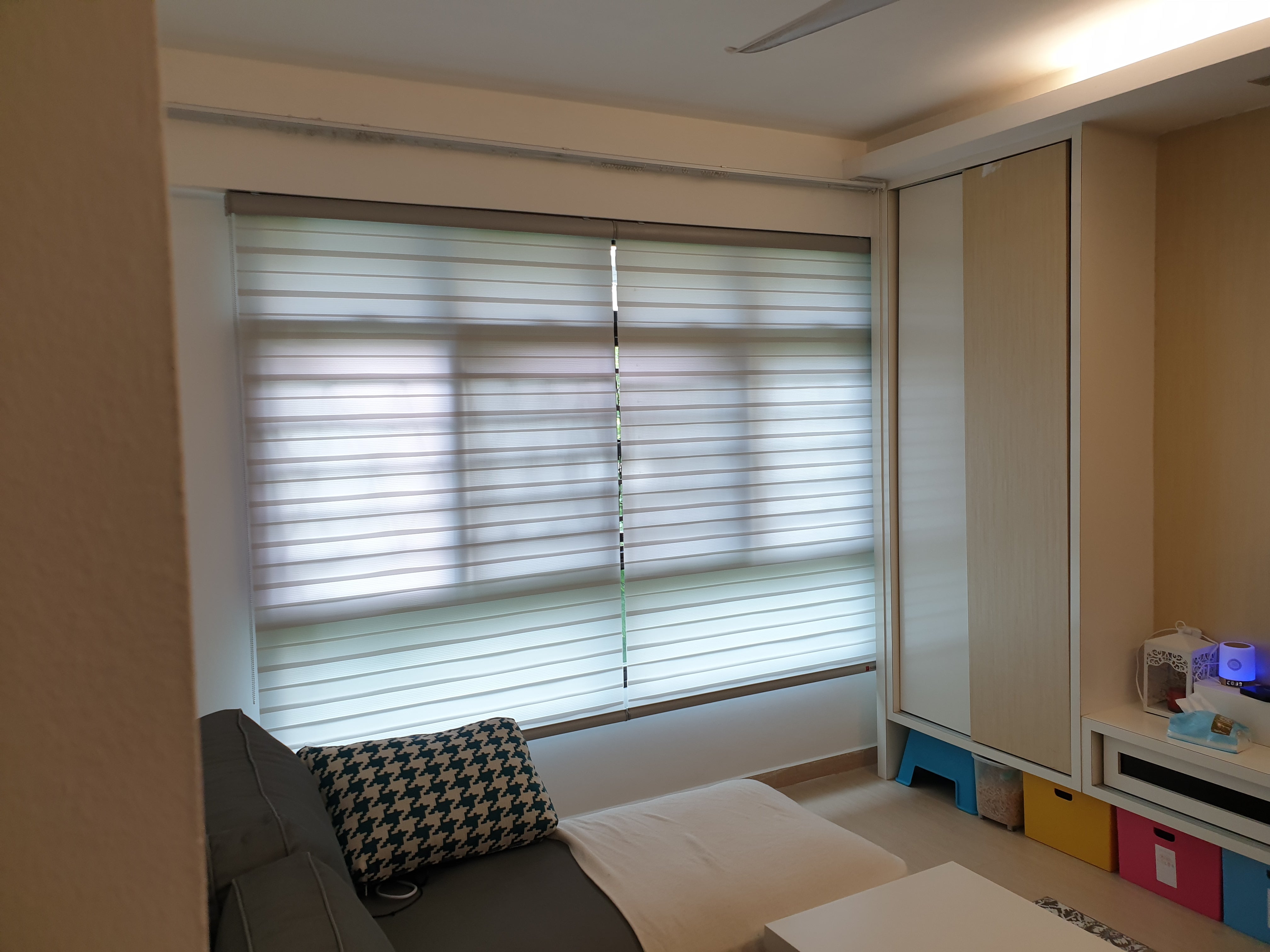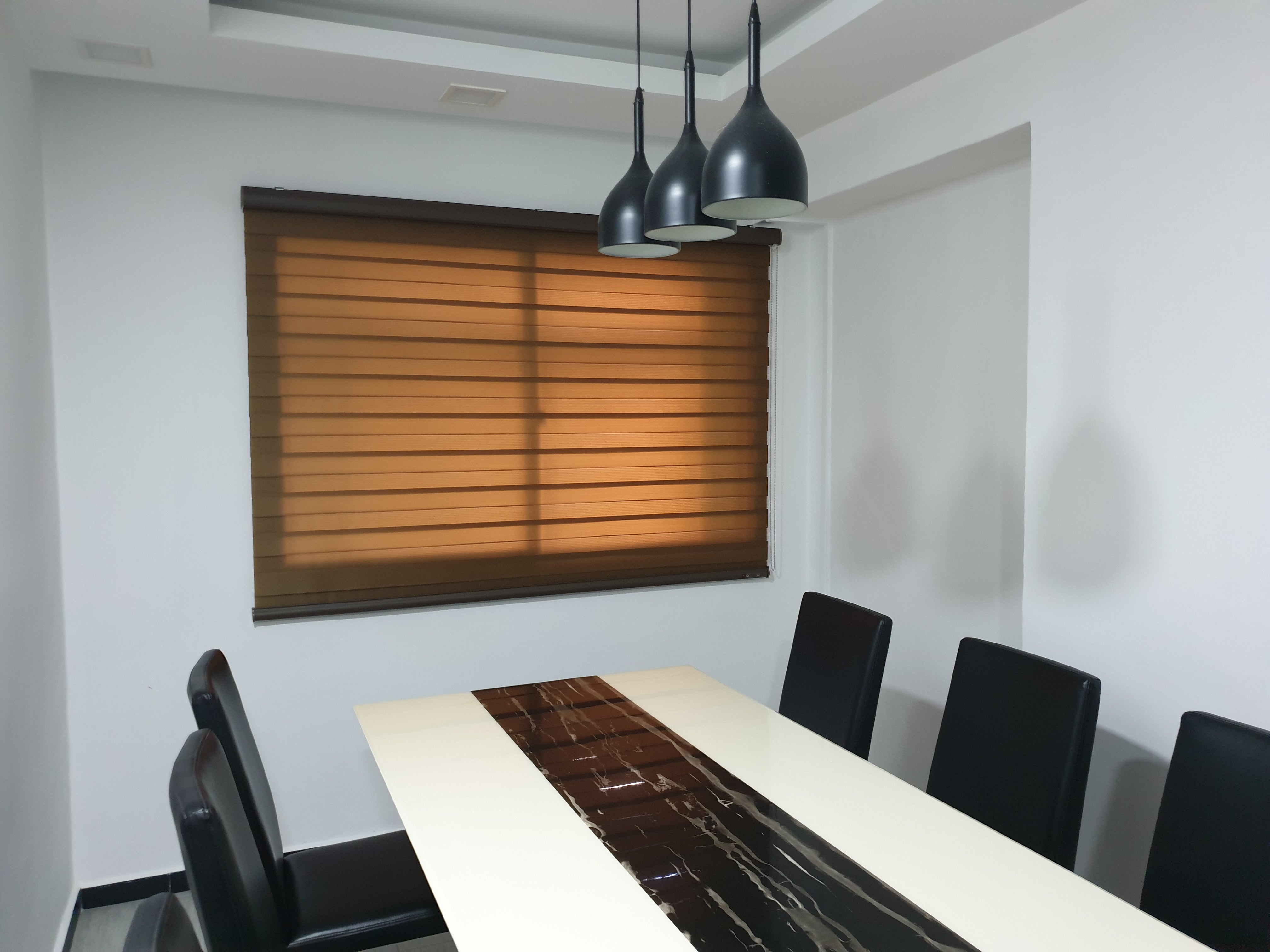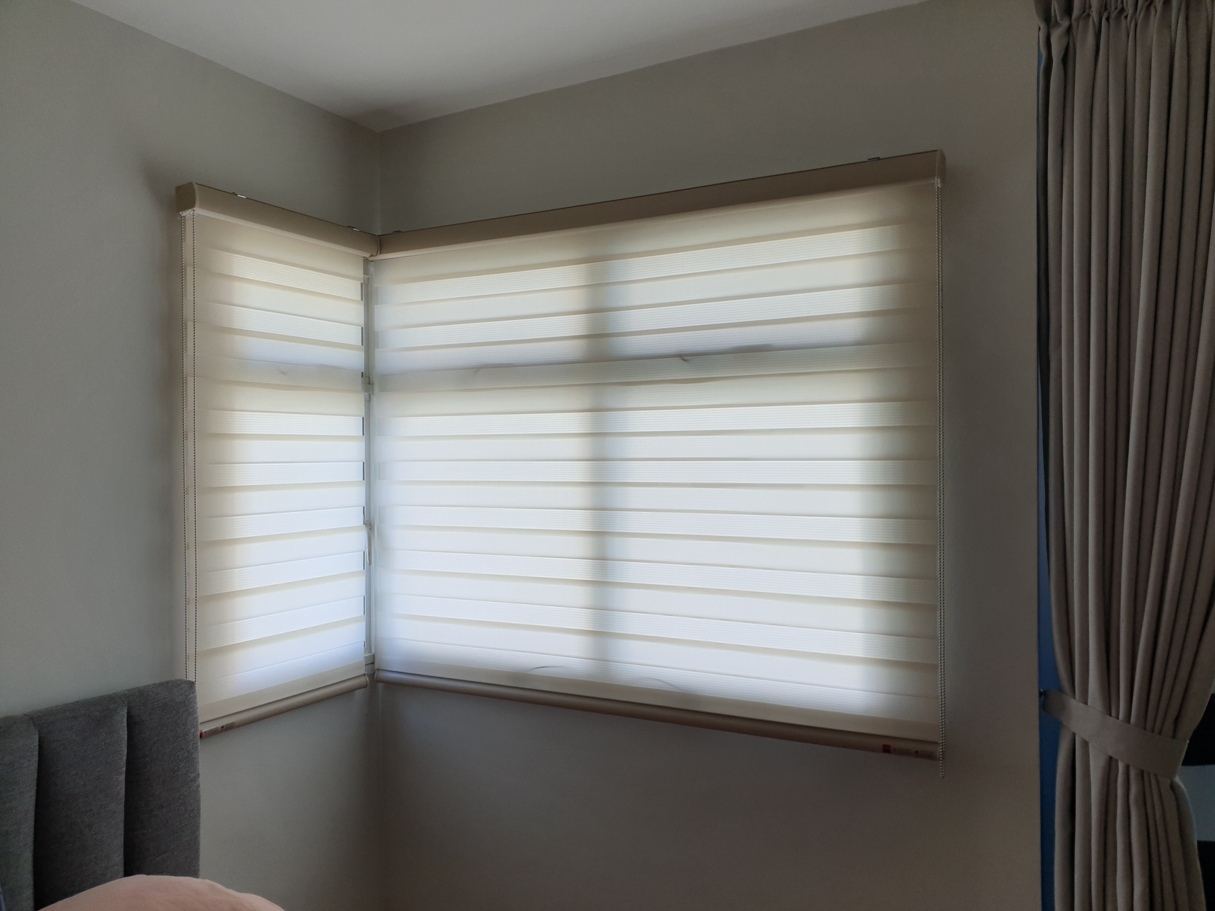 Korean Combi blinds, also known as Zebra blinds or Dual shades, are a type of window furnishing that combines the functionality of a roller shade and a Venetian blind. They consist of two layers of fabric that are attached to a single roller mechanism, with one layer made of opaque or dim-out material and the other made of netting material with horizontal stripes, allowing for different levels of privacy and light control.